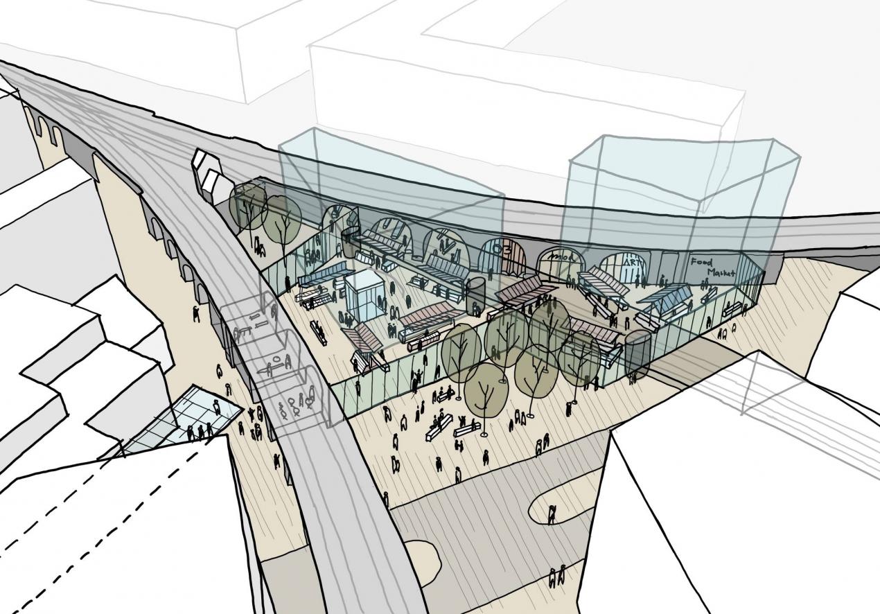 One of the most challenging tasks of the brief was to resolve the complex transport interchange hub encompassing the bus station, metro station, nearby railway station and public transport links, alongside good pedestrian and cycle connectivity within and beyond the site boundary. The vision works with the concept of integrating these transport structures into the urban grain and exploiting their potential to re-connect the area. The bus station is therefore brought as close as possible to the lobby of the metro station and at the same time naturally connected to various points in the surrounding street network. Moreover, it forms a passage increasing the permeability of the urban structure.